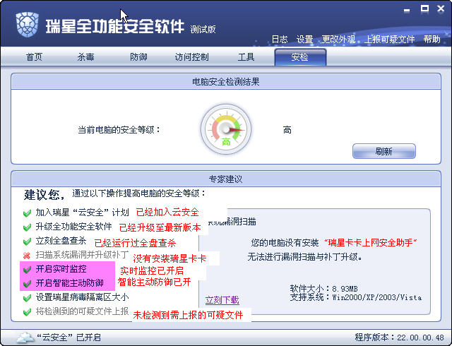 运行安检,界面左下角会列出安检的结果。但目前的结果是格式化的,并不能动态的改变提示项目。而且提示语言也不够人性化。比如检测到当前已经开启了全部监控,就应该提示“实时监控已全部开启”或者“部分监控项目未开启”等等。如下图所示。