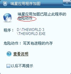 我将世界之窗程序加入应用程序加固,发现一开世界之窗浏览器瑞星提示应用程序加固发现世界之窗含危险动作,导致无法正常使用世界之窗浏览网页,请瑞星修改改进此功能对世界之窗的支持,如图(程序版本: