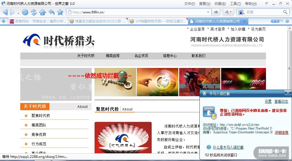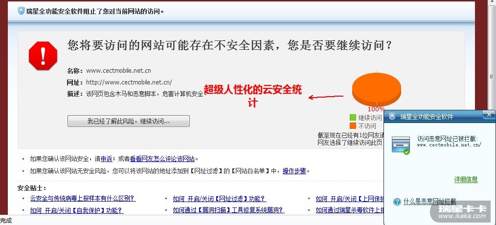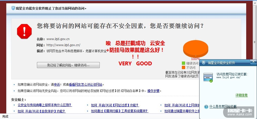 总结:瑞星防挂马的效果真的不错,不需要特征码的支持,加上云安全自动上报,形成了一套立体云安全防御体系。为广大云安全用户抵御网络威胁!!!信任瑞星