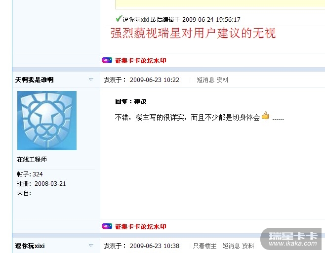 今天去看了金山的论坛,论坛很好看,比卡卡论坛好看多了,卡卡论坛很单一,还有感觉金山2010版公测很多用户自行为金山设计皮肤,板块,而且设计帖子进行加亮处理,为什么瑞星就不重视这些,工程师么老是说你有什么好的想法,那你为什么不一开始就公开征集用户的设计,很多在线工程师其实过过场的,根本没有实际意义,主要问题还是要考在线技术支持工程师回复,为什么。。说明哪些在线工程师是瑞星凭请的网友,而并非瑞星官方人员,为什么聘请我想应该是瑞星想说明瑞星很多工程师在收录建议,其实他们就是回回贴,堵堵用户的嘴,很多人工程师回复就基本不会说什么了,没回复就会说工程师怎么还没来的什么什么的。今年这么早公测我还以为瑞星能大改特改了呢,结果呢这么久这么早的公测意义何在,测试云安全的反应速度,就单一这个,今年瑞星就学了下金山2009版那样改了下外观就放出来了,虽然技术长进很大,但是如果按现在才公测方式,我觉得以后公测的人会越来越少,因为每次公测只为了修改BUG和稳定,对用户的好的建议无视,更不会再当前版本中改进,今年这么早公测我还以为很多建议可以在2010版中改进,结果呢提了这么多建议瑞星从来不会改,那样大家有何必提那些瑞星根本不会改的建议呢,浪费用户的一片好心和对瑞星的期望,反正我提了今年也不会改,明年改可能明年又有更好的建议,那瑞星是不是要后年在改了啊,为什么人家360一会一个版本,就是发现问题马上可以在下个版本中改进而且很快,我们不管他技术含量有多少,我们要的是它对用户的重视,真正把用户的建议当做自己发展的目标,我去年就建议了,应该打破一年一个版本的瓶颈,可惜估计是我自己异想天开。虽然公测快结束了,我每天点开卡卡论坛的次数是与别的网站也是无法比的,为什么就是想看看瑞星今天改了什么,用户建议了什么,可是呢我现在看见好的建议都想对他们说,瑞星不会改的,因为我的心已经凉到底了,就像卡卡,07年7月16日发布的6.0,我记的很清楚,那时候我参加了公测,很多人都提了很多建议,现在2010年都快到了,算算看好了几年了,卡卡我是鸟都不要去鸟,真是laji的没话说,瑞星呢如果我说的是错的请瑞星官方人员给个说法