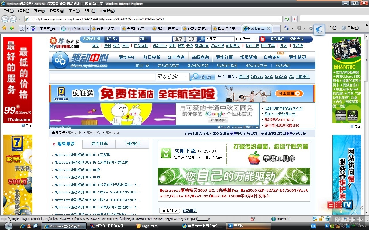 以上URL为驱动之家网站下载地址,所附JPG图像为该广告的宣传图片,所下载下来的程序不光恶意修改IE,导致我再次重新做系统,下载了很多IE修复软件都不行,请问驱动之家:做为一家大型的门户网站里的广告确包含病毒到账用户重新做系统,请问这算什么意思?为了赚钱?连网友的电脑安全也完全不顾忌了吗?