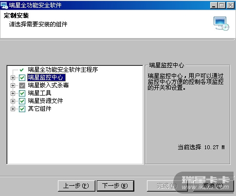 3)在“定制安装界面中”把未勾选的选项勾上。(监控红伞一般是瑞星监控中心没有勾)
