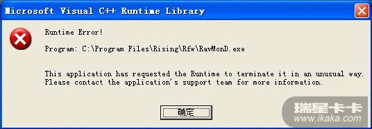 弹出Runtime error提示的解决方法。(见截图)适用产品:瑞星全功能安全软件\瑞星杀毒软件\瑞星个人防火墙