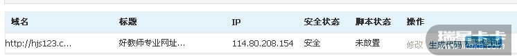 版主,您好,我以前就注册了账号,并把我的代码放到了首页,http://www.hjs123.com。我的网站今天被人挂马了,打开瑞星后台,提示我还没有把代码放到网站,所以我不知道怎么办。