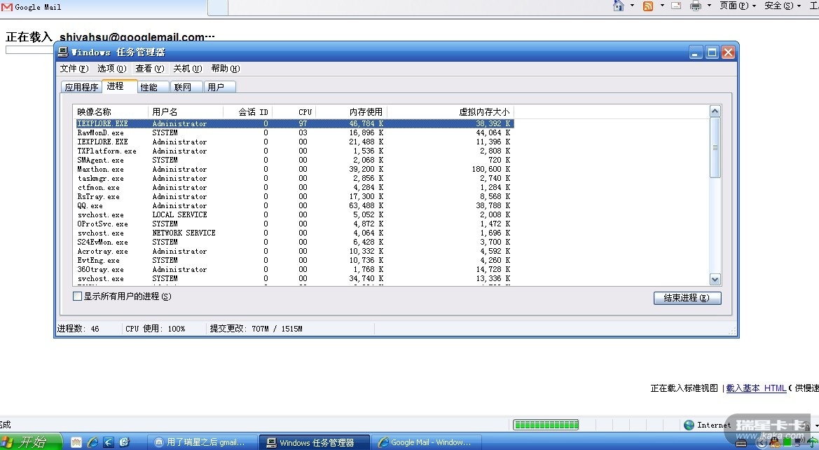 用了瑞星之后 gmail登陆超慢。cpu占用率100%,请问各位大大是怎么回事啊?