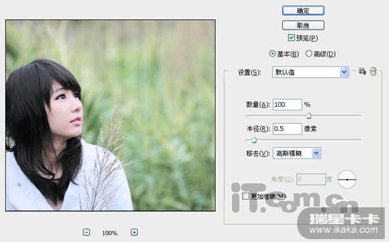 步骤8、选择“滤镜—锐化—智能锐化”命令,设置数量为“100%”,半径为“0.5像素”,如图所示,这样照片后起来更清晰。