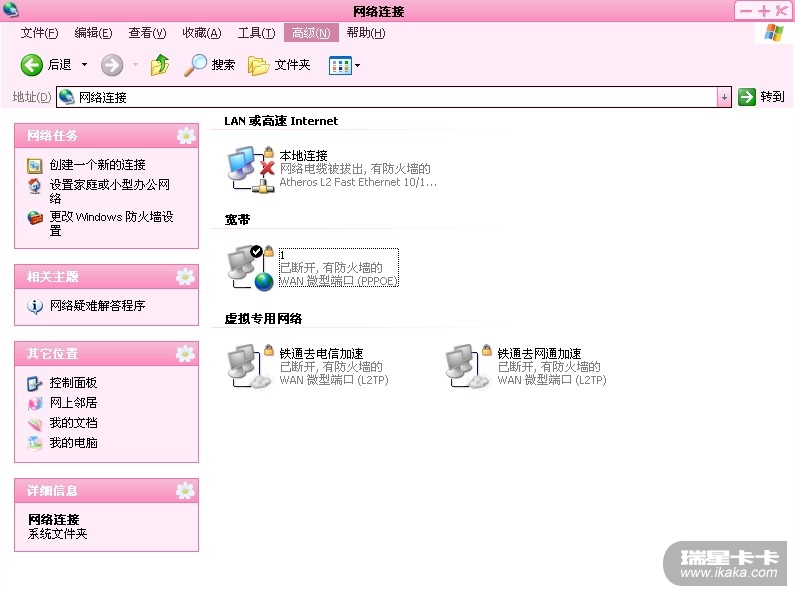我最近发现我的宽带连接成功后,右击桌面连接图标,就没有断开的选项了,没法断开,桌面右下角也不在出现两个闪动小电脑的标志,声音的小喇叭标志也没了,网上邻居里宽带连接图标旁有锁头标志,这正常吗?请教各位。谢谢。