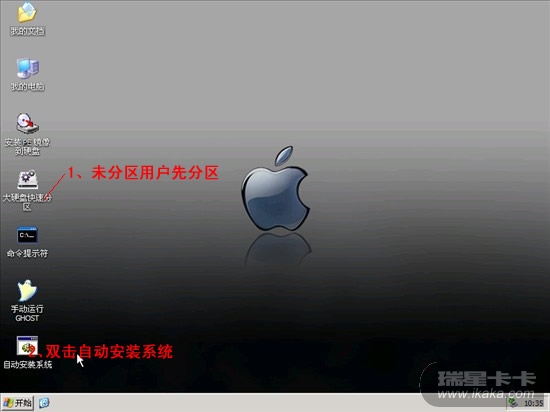 第五步,用U盘启动,进入WINPE,新本本要先分区,然后双击桌面左下角的“自动安装系统”