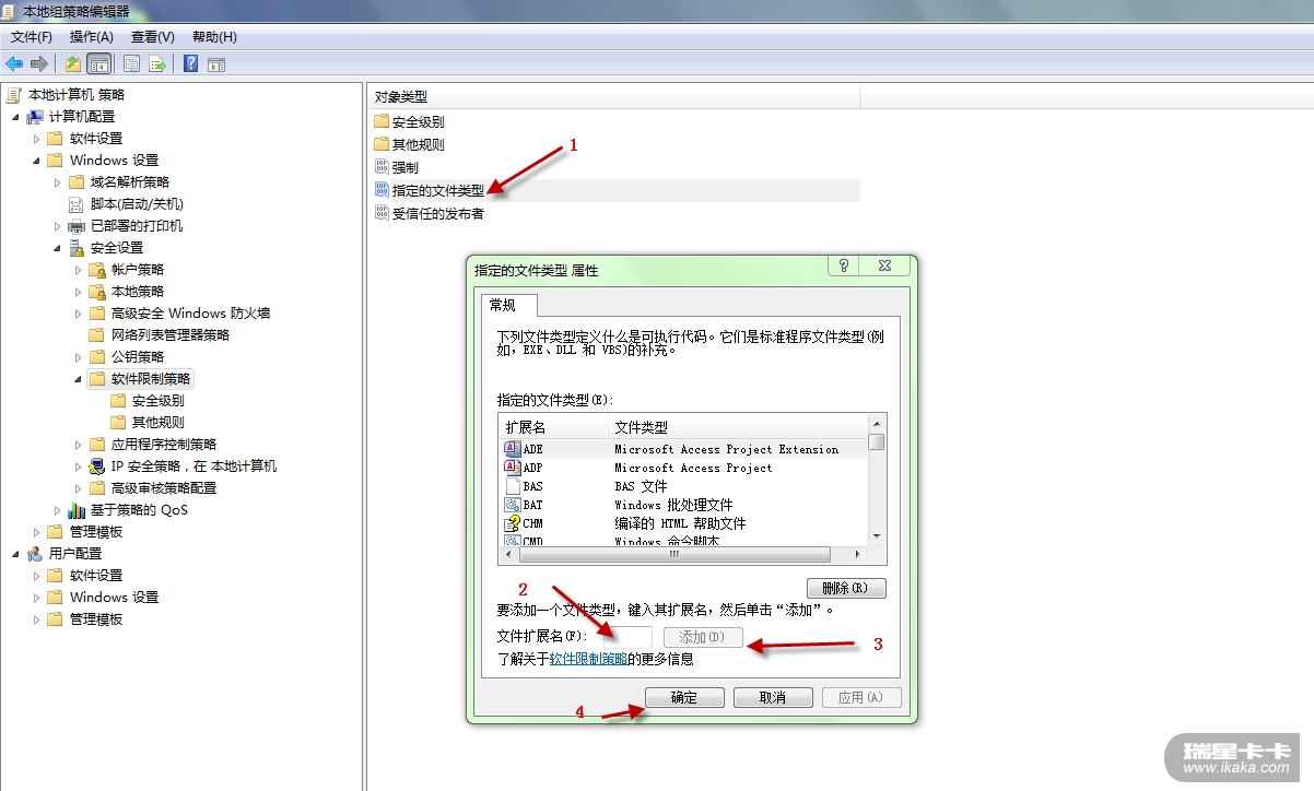 (1)在“软件限制策略”的“指定的文件类型”中添加VBS、VBE、JSE(图4-图5)