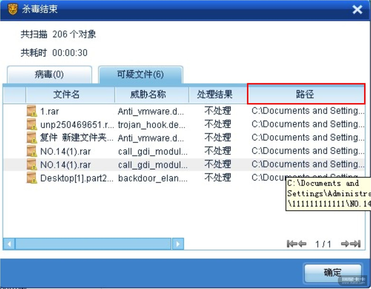 在使用右键查杀病毒时,如遇到“不处理”的病毒,就会弹出界面,此时病毒文件路径不能展开完全查看。