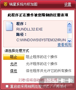 【增加一个单选框和“确定”按钮可以避免不小心按错,停止计时可以给用户更多的时间利用网络查询这个可疑动作的信息,暂时挂起进程】