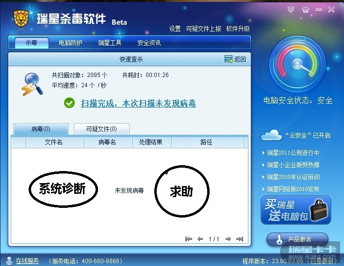 1、求助    。若系统存在杀软为截获的病毒,则一般 扫描时不会发现新病毒,若提供求助链接  工程师,有助于早点截获新病毒!!!