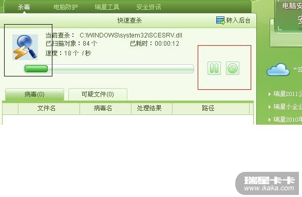 黑框的图标不要那个边框就好看了,有个框在那里感觉很怪.红框的暂停\查杀按钮应该有颜色区分,停止查杀可以用粉红色
