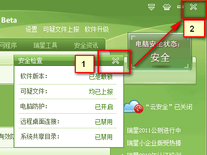 建议修改为:直接点击2处即可关闭瑞星窗口!!!