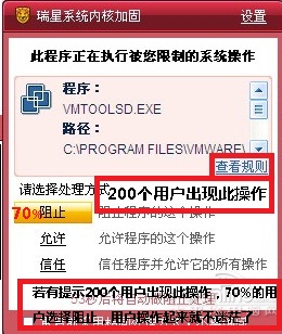 图中的  信息是:200个用户出现了此操作 ,70%的用户选择了  阻止!!!若有云安全连接其中,并有提示信息,这样用户操作起来  就简单多了
