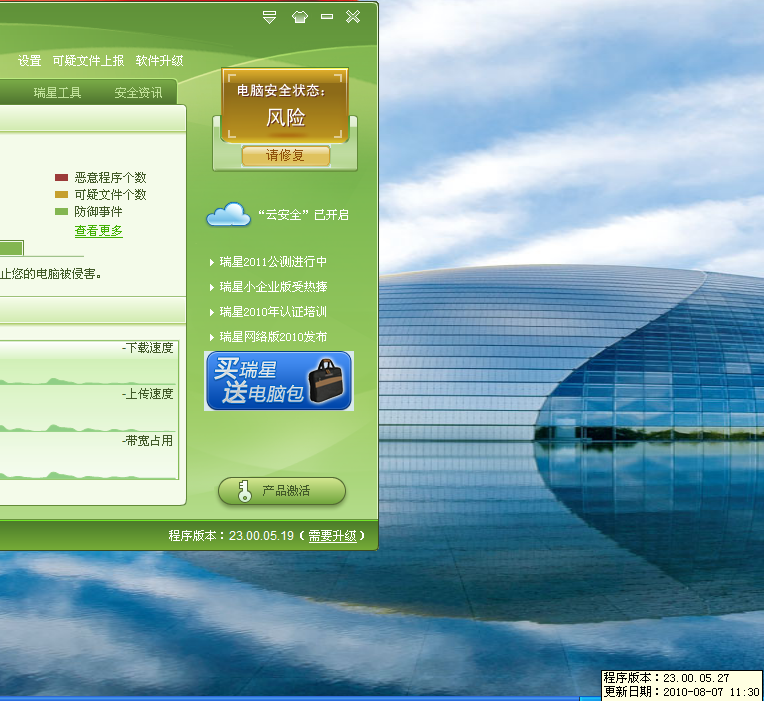 在此种情况下,瑞星版本号显示不一致,瑞星主界面显示是23.00.05.19