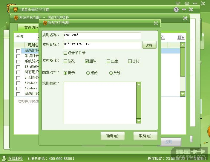 在D盘创建一个名为RAV TEST的txt文件,并添加入自定义的保护文件,触发动作时勾选“提示”