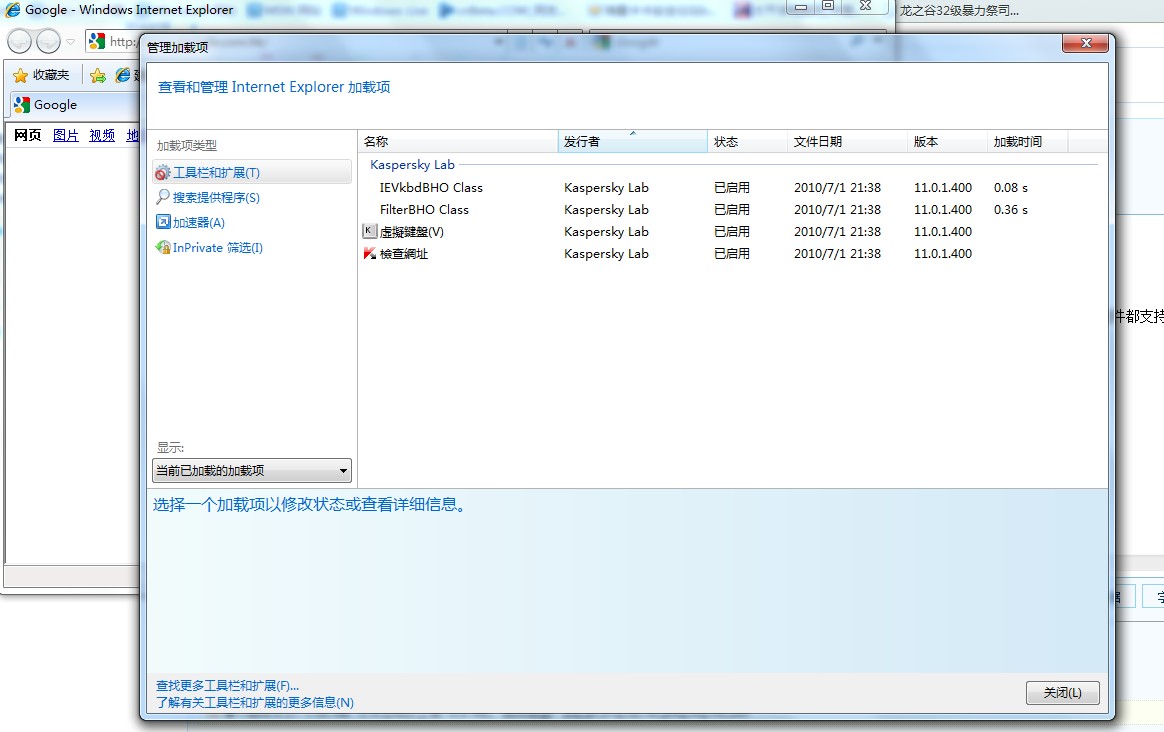 打开64位版本的IE加载项管理,发现里面有卡巴斯基的加载项,看来KIS2011在x64支持上做的很不错。