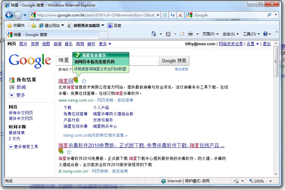瑞星RIS2011还有搜索引擎保护功能。可以在搜索引擎结果上直接看出网站是否安全。