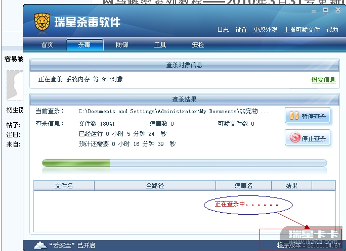 瑞星自今年8月22日开始无法升级,检测需要很长时间,结果令人遗憾,对话匡为:“请检测你的网络设置”,呵呵。重新修复杀毒软件,同样的结果。唉。昨天又可以升级,可是今天问题重现。不知怎么搞的。见图所示:
