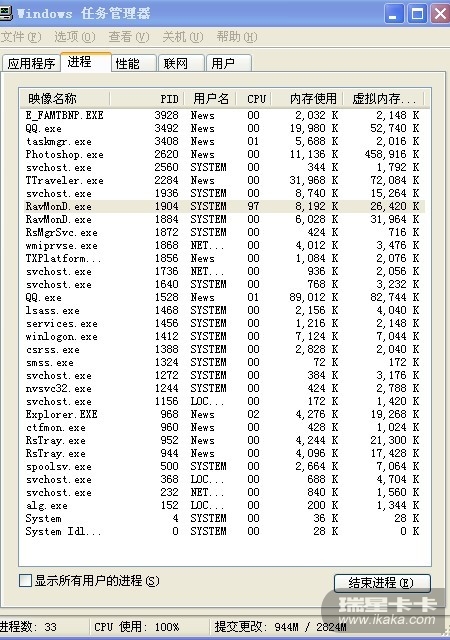刚刚开机没几分钟,然后看了几个QQ空间和几个网页,发现电脑巨慢,打开进程管理器,发现RAVMOND.exe占用了97%左右的CPU。