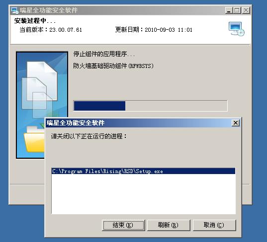 卸载时让关闭c:\Program Files\RSD\Setup.exe,点结束后,瑞星卸载程序消失(如图),重启后也不行。