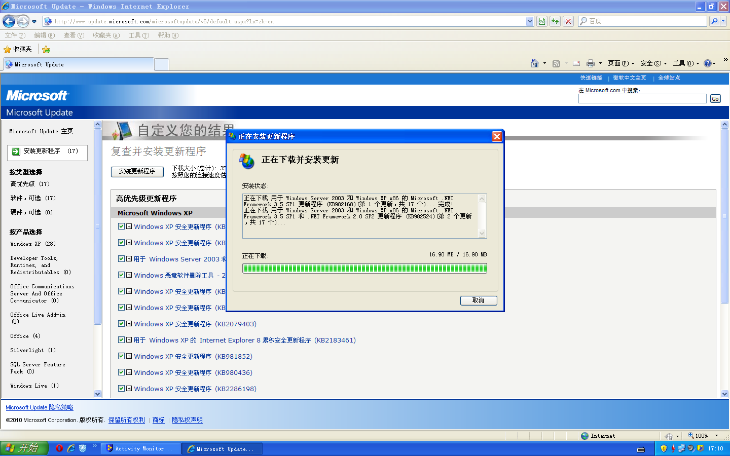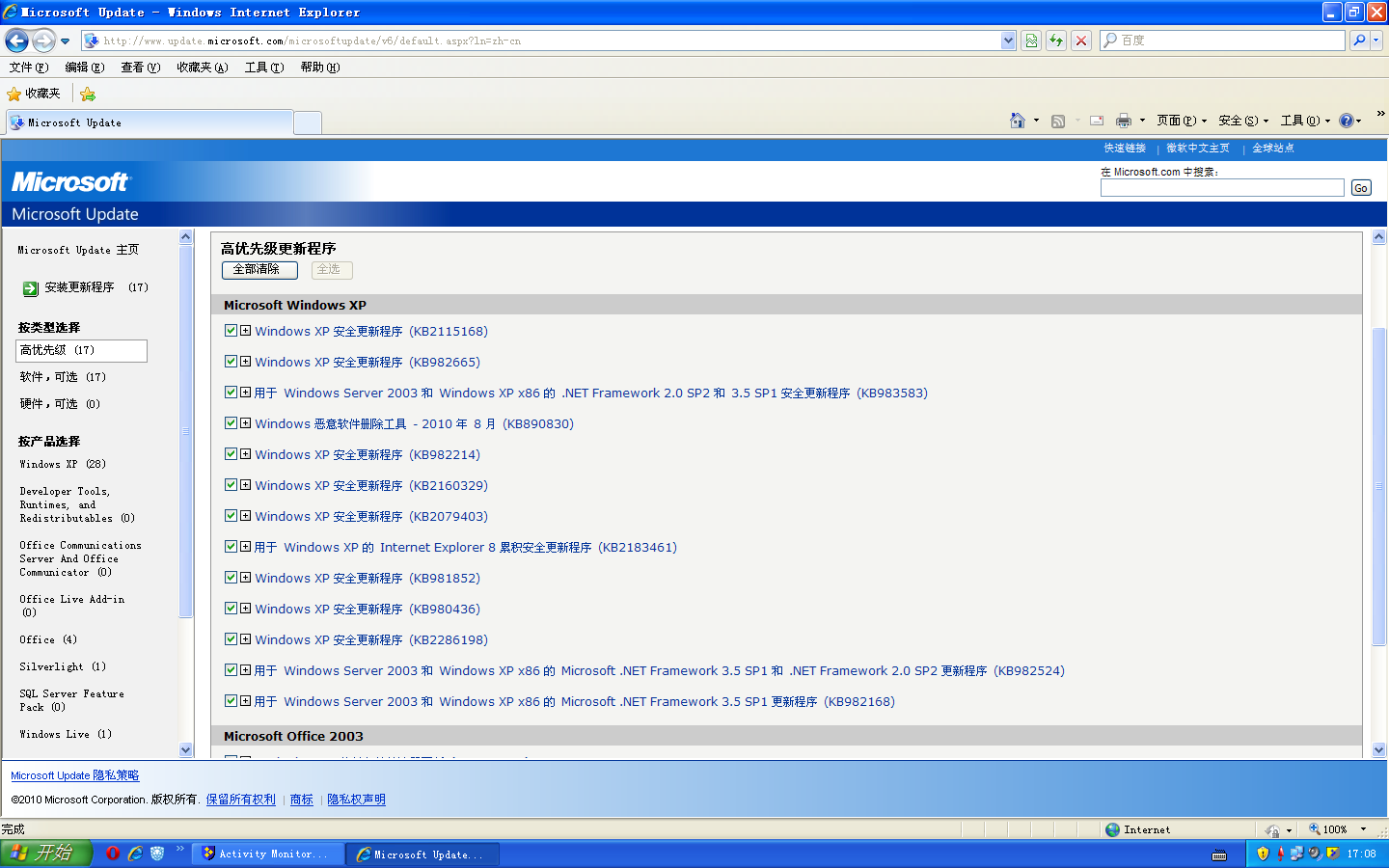 2、开启windows update,扫补丁。我滴个娘啊!缺17个补丁!