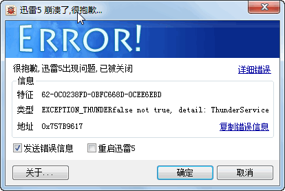 提示迅雷的服务文件为病毒,迅雷随即崩溃出现迅雷崩溃窗口。添加木马防御的白名单才解决。