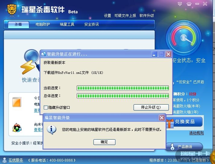 本机已经是最新版本!出现如下“当前进度”和“总体进度”的滑动安装界面,我私下认为有点欠妥,等到滑动条到头后,才出现“您的电脑上安装的瑞星已经是最新版本,此时不需要升级”??不知是否“BUG”谢谢!!!