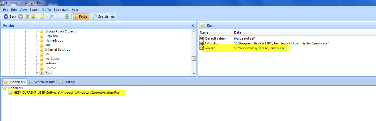 鉴于此毒禁止windows的注册表编辑器,因此用第三方注册表编辑工具添加一个IFEO劫持项,将病毒程序serverx.exe劫持到一个事先建好的空文件C:\1.exe。