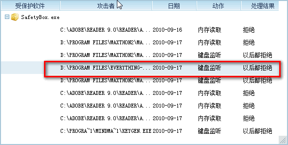 问题描述:在everything中显示的文件上点击右键时,触发保险箱的报警,且右键菜单经常无法弹出