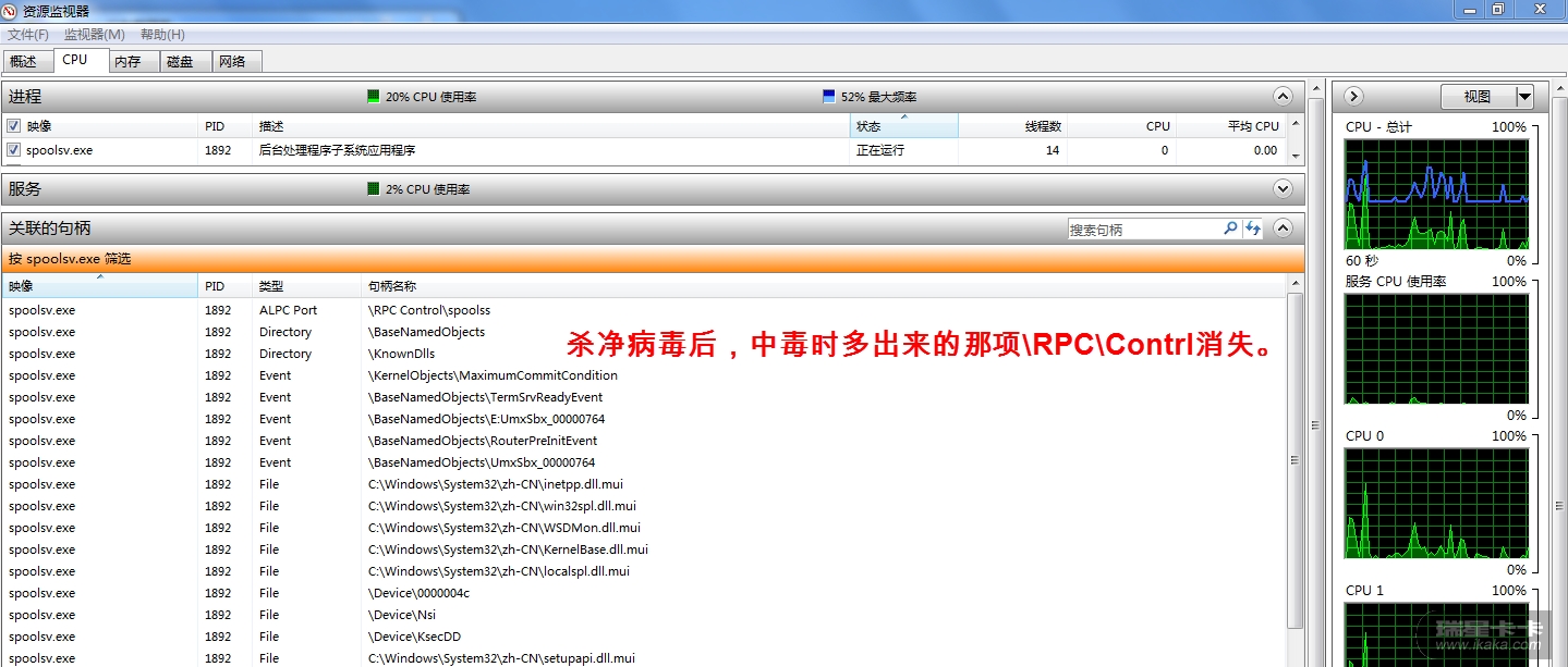 中此毒后,用WIN7的资源监视器查看spoolsv.exe进程关联的句柄,也能发现中毒后的蛛丝马迹: