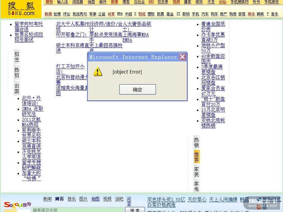 别的网站没这现象,只唯有搜狐出现object Error对话框,页面都错乱了,清理临时文件没用,怎么把进搜狐出现object Error对话框去掉?
