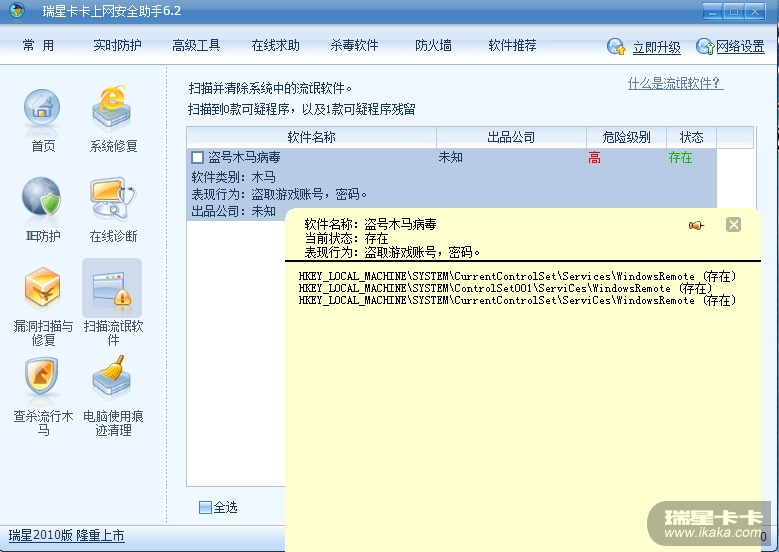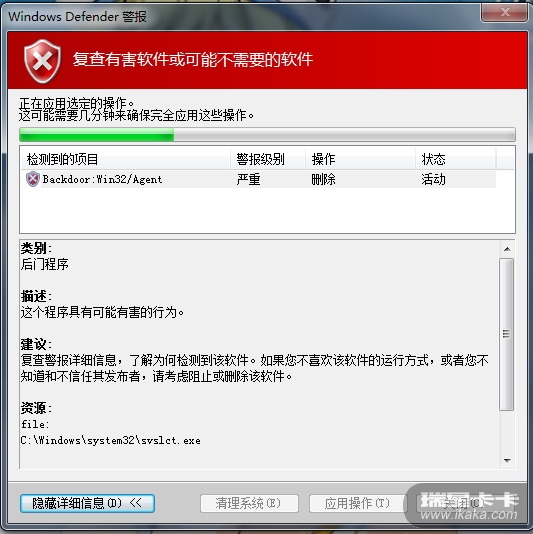Win7自带的windows defender开机时检测到c:\windows\system32\svslct.exe这个进程是Backdoor:Win32/Agent,用瑞星全功能安全软件查了半天都没查个所以然来,又下载了卡卡查了下启动项之类的也没见有问题的,windows defender删除了之后一重启机子又出现提示要删除。。。而且启动Win7系统,登录后会自动闪过一个Install,一闪就没了,搞不清是啥东东,有可能就是这个造成的,谁知道是啥东东?
