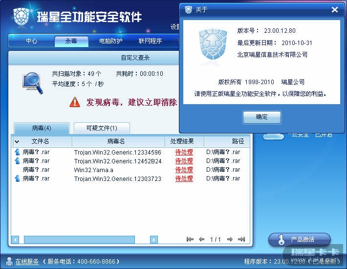 感觉2011版用一个词来形容就是大开杀戒!昨天用最新版的Microsoft Security Essentials、卡巴斯基、金山毒霸扫描为正常的文件(几个注册机,1个声卡驱动文件),瑞星都认为是病毒!还有其他11个貌似“可疑”的文件更是胡说八道(包括搜狗输入法的2个DLL文件、渤海证券交易软件的文件等等)!