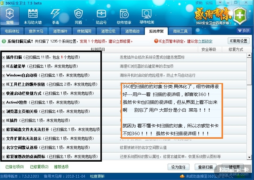从上图 扫描项目来看,似乎卡卡比360 7,5bt版 扫描的项目要少!!!