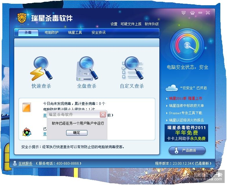 瑞星卡卡安全论坛个人产品讨论区瑞星杀毒软件瑞星杀毒软件2011 打开杀毒软件时,出现“软件已经在另一个用户帐户中运行”?
