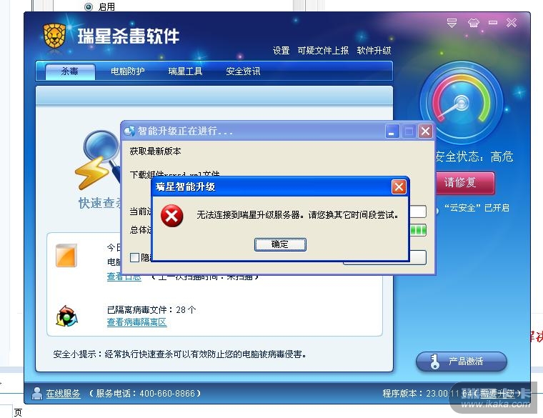 从11月1日起,我的瑞星杀毒软件就不能升级了,但此时防火墙仍能够升级。从11月23日防火墙升至23.00.12.07版后,再也升不了了,但测试连接时,仍能够连接!如下附图: