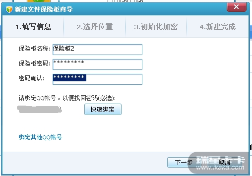 首先是在创建的时候,也就是我上一贴提出的类似绑定邮箱的功能,参看下图。这个可以绑定QQ,看起来是绑定QQ,但是感觉好像一个二代密保。(但只是快速绑定)瑞星可否在创建的时候提供二级密码进行找回呢?
