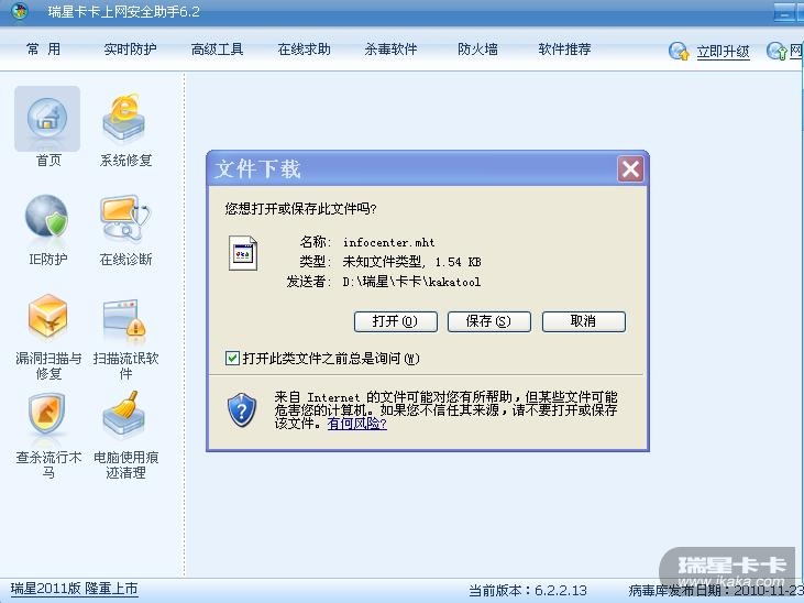 kakatool目录内全是这种图标(见图)。曾用卡卡粉碎过“雨林木风”GHOST_XP_SP3内的一个自动连网软件,从那以后每次启动卡卡都会弹出这个“文件下载”界面。