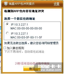 我这是单位的机子,局域网,所以在瑞星全功能上设置了防arp欺骗,但是这次,不知道为甚么总是出现这个提示