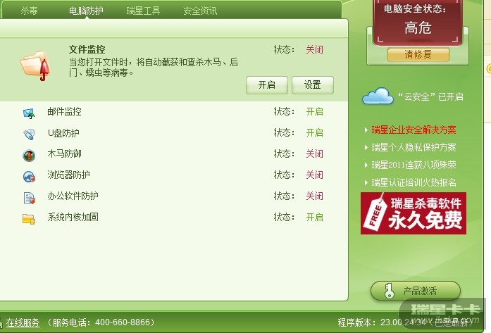 回复: 瑞星杀毒软件:“电脑安全状态高危。但是无法修复