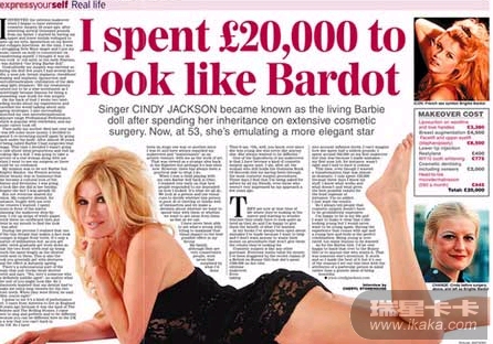 变得更漂亮是不少女人的梦想,但是,有多少人能有勇气对自己动刀子呢?个性大胆、奔放的欧美女性一直走在各种时尚运动的最前端,譬如,来自伦敦、曾创下世界上整容次数最多的55岁女子辛迪-杰克逊(Cindy Jackson),为了让自己看起来像芭比,不惜花10万元美元开刀无数,如今,前后判若两人,容颜也年轻得似真人版芭比。