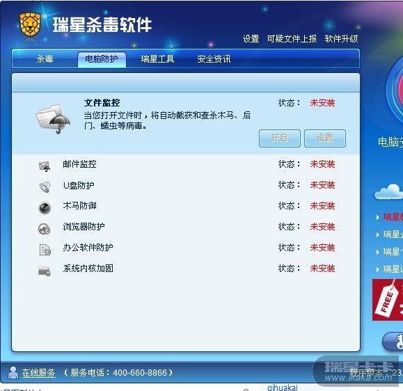 瑞星的绿伞还在,但是监控全部无开,除了执行杀毒什么也干不了。设置不能正常显示,右击绿伞什么也没有,看来已经成了空壳。修复过后问题不能解决。瑞星网上杀毒只是杀了个什么Packer.Win32.Agent.GEN的。无奈了,求大虾点拨