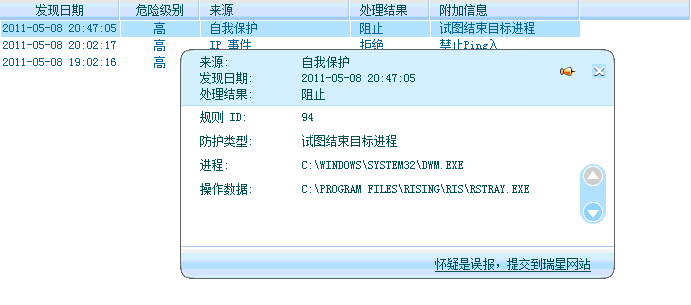 如果点了结束进程,也没有反应。要等瑞星假死结束之后,才会出现自我保护提示。