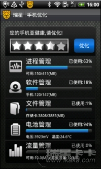 为您提供手机进程、手机应用程序、存储卡文件和电池使用等管理功能,您可以使用一键优化功能关闭无需开启的进程和外设,降低手机的耗电量,确保您的手机健康运行。还可以随意终止一些不希望运行的程序,或者可疑的应用程序。