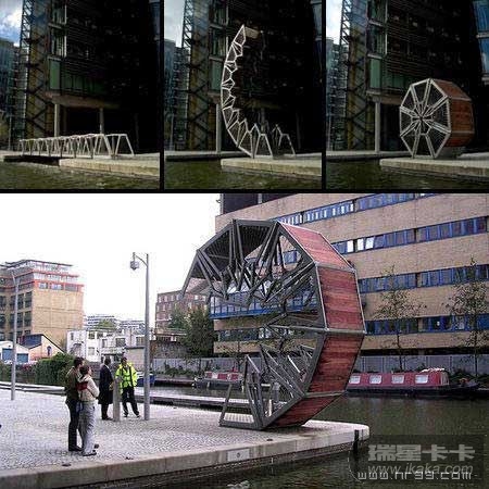 这座神奇的可收缩移动的桥梁位于英国伦敦帕丁顿,由Thomas Heatherwick设计,桥身长12米,它的特殊之处在于平时只是一座普通的钢结构人行桥,但它具有特别的可伸展可收缩的八段结构,一旦有船只通过河面时,桥身就会自动卷起变成圆环形,使得船只可以顺利通过,设计创新大胆。