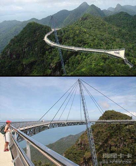 这座壮美的大桥位于马来西亚的兰卡威群岛,建成于2004年10月,主体由钢材料构成,桥型呈圆弧状,可使游客从不同的角度饱览安达曼海和泰国塔如涛岛的美丽风景。这座桥因为离地面高而且很窄,穿越它是一项极具挑战性的任务,从而吸引了很多爱好冒险的游客慕名前来。
