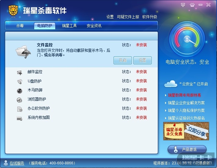 我的2011版瑞星杀毒软件的电脑防护全部未安装,我重新下载安装也没用