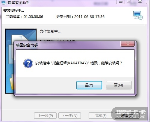 今天安装瑞星安全助手,中间突然提示受到某一进程干扰(具体记不下来),之后是托盘框架kakatray无法安装。不知道这个问题应该怎么解决